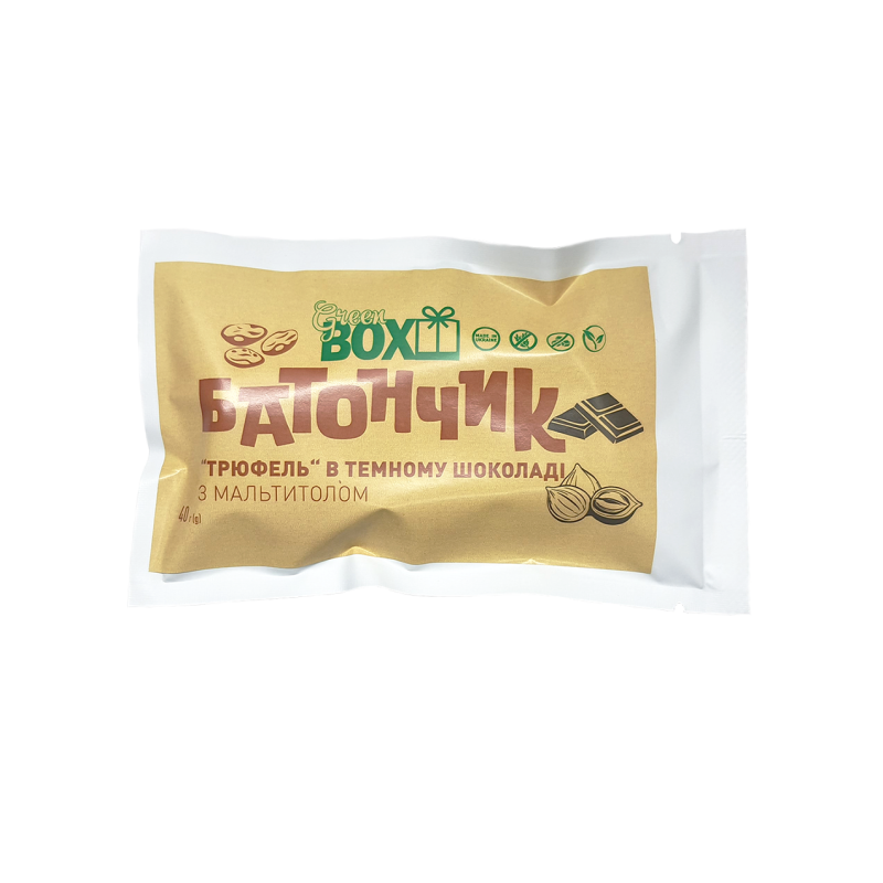 Теги: Батончик Трюфель в темному шоколаді, 40 грам, без глютену, без цукру, веган