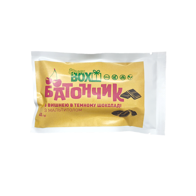 Теги: Батончик з Вишнею в темному шоколаді, 40 грам, без цукру, веган, без глютену