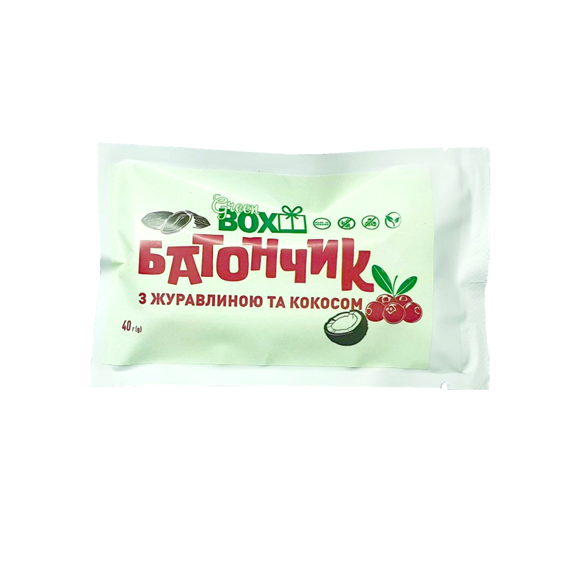 Теги: Батончик з Журавлиною та кокосом, 40 грам, без цукру, веган, без глютену